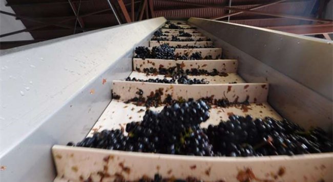 13. 經(jīng)過篩選后的葡萄會進(jìn)入除梗機(jī)中進(jìn)行去梗。大部分酒莊現(xiàn)在使用的是去梗和破碎一體化的機(jī)器,所以在去梗的同時,葡萄果實(shí)可能會被輕微壓榨或者完全壓榨(白葡萄品種)。