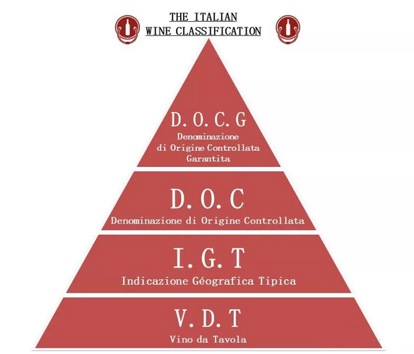 意大利的葡萄酒分級制分4個等級,從高到低依次為:DOCG(最高級)、DOC、IGT、VDT(普通等級餐酒)。不過,這個分級制度僅供參考,因為也有很多酒莊認為一些規定太死板,而不搞這套,有時一些意大利頂級葡萄酒竟然只標VDT或IGT也不足為奇。