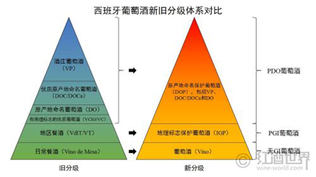 早在1932年,西班牙就仿照法國的原產地命名控制(Appellation d’Origine Controlee,簡稱AOC)制度,創(chuàng)立了原產地命名(Denominacion de Origen,簡稱DO)制度。2003年,西班牙在原有制度的基礎上,又建立了類似法國的葡萄酒分級體系。這一體系從低至高共分為6級: