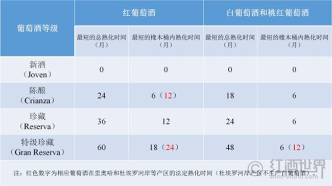 除了跟隨法國和歐盟的腳步之外,西班牙葡萄酒的分級也有著自己的特色,那就是對于DO及以上級別葡萄酒最短的總熟化時間和在橡木桶內熟化時間的要求。西班牙根據(jù)熟化時間將葡萄酒分為4個等級:新酒(Joven)、陳釀(Crianza)、珍藏(Reserva)和特級珍藏(Gran Reserva),這幾個術語也是我們常在西班牙紅酒的酒標上見到的。各級別對于熟化時間的要求見下表: