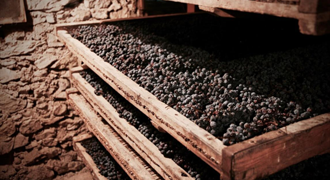阿瑪羅尼葡萄酒獨樹一幟的風格,離不開其令人津津樂道的釀造方法——帕賽托法(Passito Method)。帕賽托法指的是用風干的葡萄釀造葡萄酒的工藝,因而又稱枯藤法(Appassimento)。每年葡萄成熟季時,酒莊的工作人員會提前采收葡萄,這時葡萄的酸度還很高,采收后并不急著將它們送去釀酒,而是將葡萄放在通風良好的室內風干幾個月,使果實流失部分水分,糖分和風味物質得以集中。這種方法可以為成酒增添風味、酒體和酒精度。