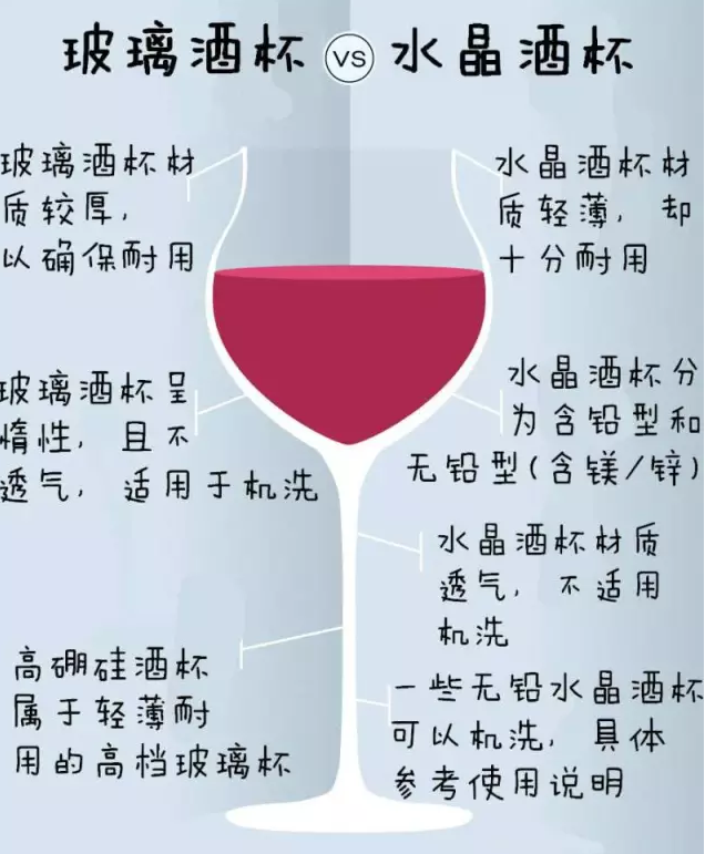 喝葡萄酒的酒杯種類繁多,形狀各異,再加上市場上各種商店價位……如何挑選適合的酒杯便成為了一件頭疼的事情。在選購的時候,除了需要關注酒杯的形狀外,材質也是不可忽略的要點。