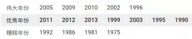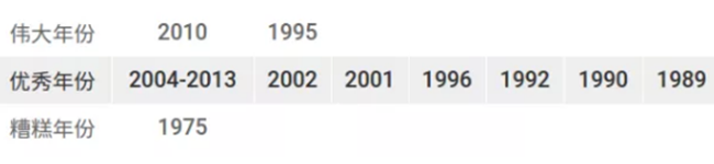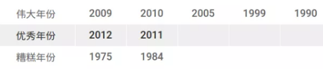 建議:如果想要一瓶馬上可以喝的品質優異的勃艮第的話,2009年份是很好的選擇。這一年的勃艮第普遍酸度較低,單寧成熟度較高,適合較早飲用。2010年份的夜丘也不錯,不過該年份產量較低,不太容易買到合理價位的酒。2011年份則表現不均勻。對于收藏家來說,2005年份仍然是首選,前提是你現在還能買得到!