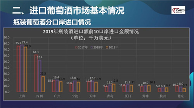 在仔細分析口岸數據后就會發現,深圳由2018年的5.24億美元,迅速下滑到2019年的2.55億美元。我認為這與2018年,深圳口岸由于種種原因進口了大量的高端酒、奢侈酒有關。進一步去想,2019年整個大盤下跌15%,受高端酒、奢侈酒的影響較大,整個市場其實并沒有受到過多沖擊。