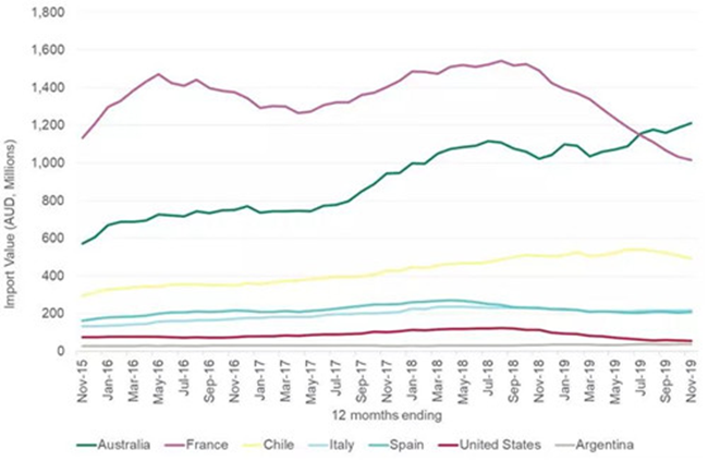 近日,澳大利亞葡萄酒管理局公布了最新出口報告。截至2019年12月底的12個月,澳大利亞葡萄酒對中國市場的出口總額及平均出口額雙雙創(chuàng)下年度新高。