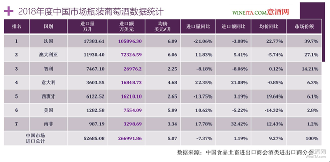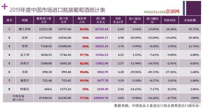 近日,中國食品土畜進出口商會酒類進出口商分會發布了來自中國海關的2019年度中國進口葡萄酒統計數據。2019年中國進口葡萄酒總量為61245.88萬升,進口總額為24.3371億美元,分別相比2018年下降了10.91%和14.8%。進口葡萄酒均價為3.97美元/升,同比2018年度下降了4.57%。