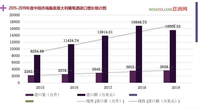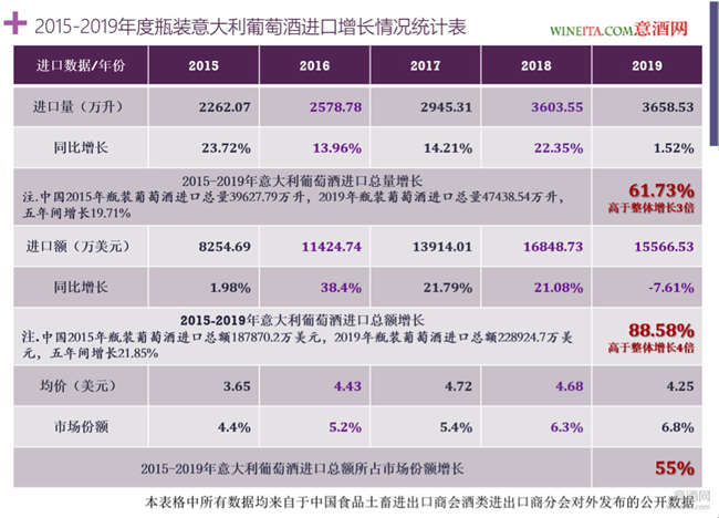 為了方便業(yè)內(nèi)人士更好的理解意大利酒近五年來的成長,意酒網(wǎng)將2015-2019年中國進(jìn)口瓶裝葡萄酒統(tǒng)計數(shù)據(jù)重新整理,將五年來意大利葡萄酒的進(jìn)口量、進(jìn)口額、均價和市場份額進(jìn)行對比,得出上圖的2015-2019年度瓶裝意大利葡萄酒進(jìn)口增長統(tǒng)計表。