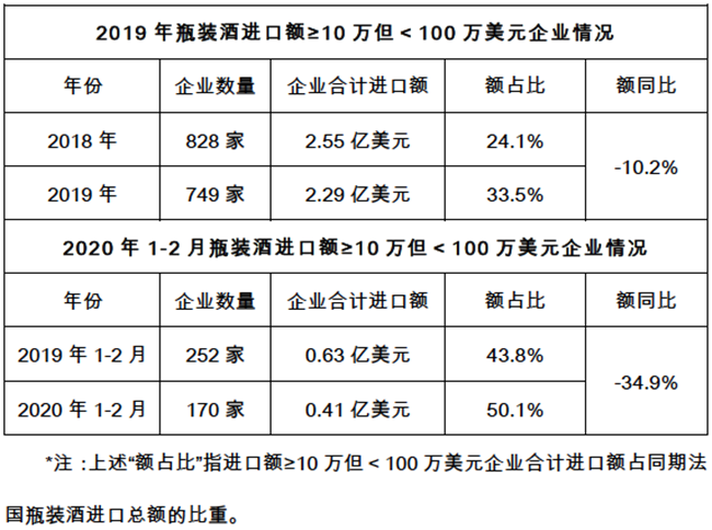 與澳洲一樣,法國瓶裝酒進口商中絕大多數(shù)是小型企業(yè)(指進口額≥10萬美元但<100萬美元的企業(yè))和微型企業(yè)(指進口額<10萬美元的企業(yè)),并都在今年1-2月疫情影響下家數(shù)減少,且進口總額高幅低開。