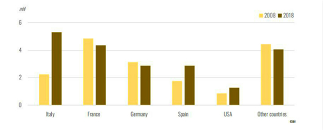 2018年,意大利起泡酒的出口量為3.9億升,占全球起泡酒出口市場的43%。主要出口市場為英國、美國、德國。出口值為15億歐元。