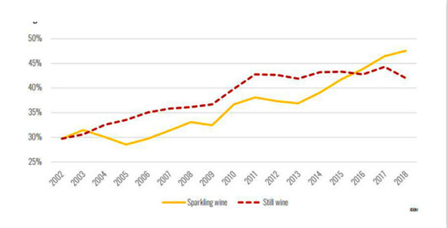 在過去,起泡葡萄酒的國際貿易少于靜止葡萄酒。但從2016年開始,這一趨勢發生了逆轉。2018年,起泡葡萄酒所占貿易份額為48%,而靜止酒為43%。