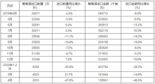 2015-2020年4月中國(guó)葡萄酒進(jìn)口金額及增速