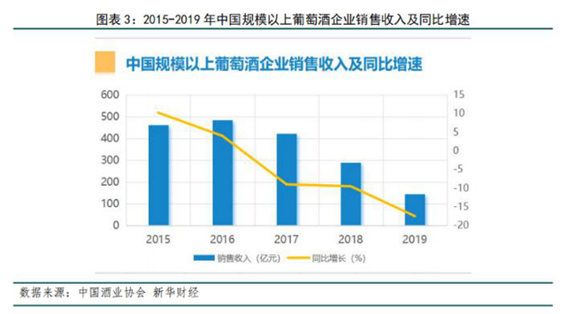 2019年,全國規模以上葡萄酒企業數量155家,銷售收入145.09億元,同比減少17.51%;實現利潤總額10.58億元,同比降低16.74%。2020年第一季度,銷售收入18.95億元,下降44.02%;利潤0.01億元,下降99.24%。全國葡萄酒行業規模以上企業經濟效益在2019年本就低迷的情況下,受新冠肺炎疫情影響,在2020年第一季度顯得更加慘淡。