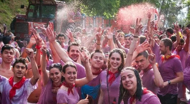 這一天,成百上千人會(huì)穿著白色衣服、系著紅色方巾,拿著水槍、噴霧器、水桶等可以裝著葡萄酒的容器作為“武器”,在街道上開始這場“戰(zhàn)爭”。最終他們將衣服染成紫色,“幸存者們”伴隨著音樂返回拉巴斯廣場,享用午餐(特色蝸牛)和美酒。