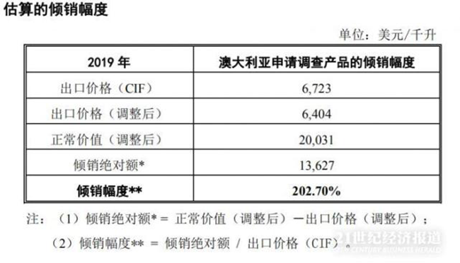 申請書認為,在進口數量持續大幅增長、市場份額持續上升、相對于國內同類產品總產量的比例也在持續上升的情況下,澳大利亞該類葡萄酒的降價行為對國內產業造成了巨大的沖擊,申請書預估,澳大利亞該類葡萄酒的傾銷幅度為202.70%。