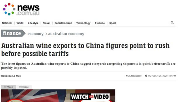 澳新網(wǎng)報道,根據(jù)澳洲葡萄酒機構(gòu)(WA),2019年9月至2020年9月,澳洲出口至中國(包括中國香港、澳門地區(qū))的葡萄酒價值達(dá)到了創(chuàng)造紀(jì)錄的125億元。