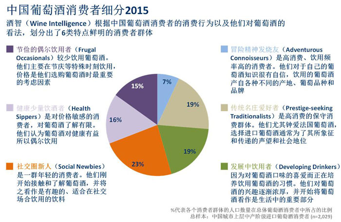 針對中國的3800萬進(jìn)口葡萄酒消費(fèi)者,酒智(Wine Intelligence)劃分出了6類特點(diǎn)鮮明的消費(fèi)者類別。除了上述提及的 “發(fā)展中飲用者”(Developing Drinkers),其他5類包括“冒險(xiǎn)精神發(fā)燒友”(Adventurous Connoisseurs)、“傳統(tǒng)名莊愛好者”(Prestige-seeking Traditionalists)、“社交圈新人”(Social Newbies)、“健康少量飲酒者”(Health Sippers)和“節(jié)儉的偶爾飲用者”(Frugal Occasionals)。酒智(Wine Intelligence)的消費(fèi)者劃分不僅基于年齡、性別和收入等基本信息,還涉及消費(fèi)者的購買飲用行為以及他們對于葡萄酒的看法,包括:他們?yōu)楹物嬘闷咸丫疲绾巫龀鲑徺I決定,以及飲用何種葡萄品種和產(chǎn)地等等。