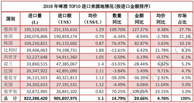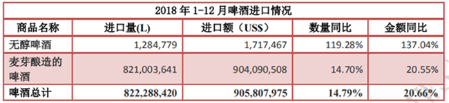 2018 年,啤酒進口增長提速,進口量 8.2 億升,同比增長 14.8%,進口額 9.1 億美元,同比增長 20.1%,約占酒類進口總額的 15.7%,位列進口酒類第三位。
