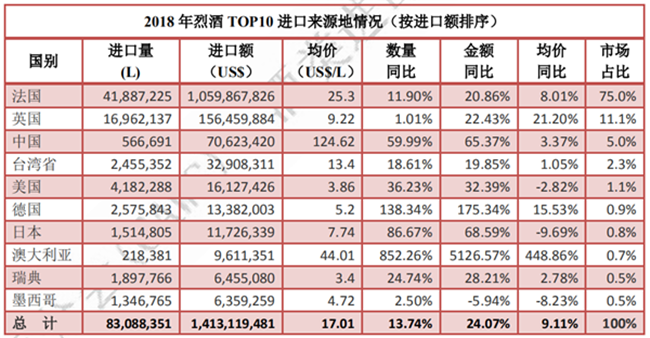 (1)白蘭地進口額增至 10.6 億美元,同比增幅為 20.6%,占烈