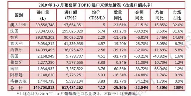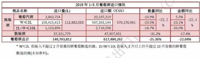 近日,中國食品土畜進出口商會酒類進出口商分會發布2019年一季度酒類進口統計報告。報告顯示,一季度,進口酒類市場整體呈下行態勢,且降幅仍在擴大。其中,葡萄酒進口延續跌勢,量額跌幅均逾兩成。進口量1.5億升,進口額6.2億美元,約占酒類進口總額的55.4%。