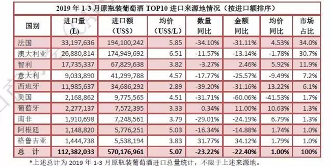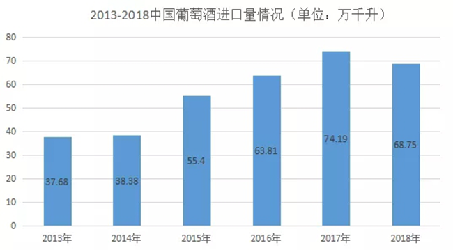數據是反映市場的晴雨表。2013~2018年上半年我國葡萄酒的進口量逐年遞增,2018年上半年,我國葡萄酒進口量為38.54萬千升,同比增長25.8%。但從下半年開始,局勢發生逆轉,最終,2018年度葡萄酒以68.75億升的進口量收尾,同比下降8.26%,從上面的數據分析可知,2019年一季度下滑態勢仍未扭轉。