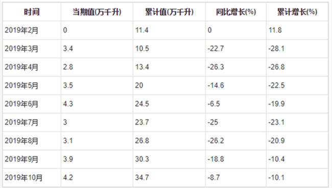 2019年1-10月全國葡萄酒產量分月數據