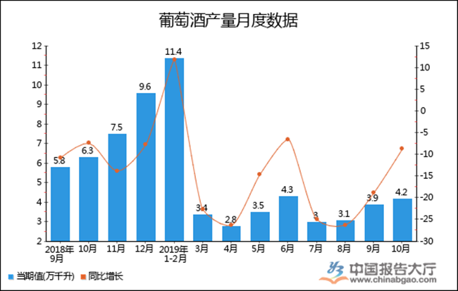 根據中國報告大廳對2019年1-10月全國葡萄酒產量進行監測統計顯示:2019年10月全國葡萄酒產量4.2萬千升,同比下降8.7%,2019年1-10月全國葡萄酒產量為34.7萬千升,累計下降10.1%。