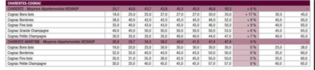 AOP白蘭地產區的葡萄園平均價格上漲了3.8%,專家介紹說,“在干邑白蘭地產區,漲勢仍在繼續,但增速卻有所放緩。因為干邑白蘭地產區委員會通過了擴大葡萄園種植面積的決議,從而緩解了當地葡萄園價格的壓力。”