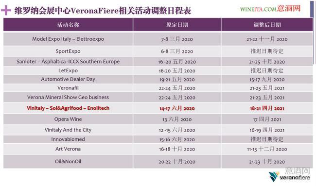 2月26日,意大利維羅納會展公司曾宣布本屆VinItaly將如期于2020年4月19日至22日在維羅納(Verona)市舉行。3月3日晚間,意大利維羅納會展公司(Veronafiere)宣布更改決定,將本屆VinItaly延至2020年6月14-17日舉行。20天之后,維羅納會展公司再次宣布,確定將本屆VinItaly延期至2021年。