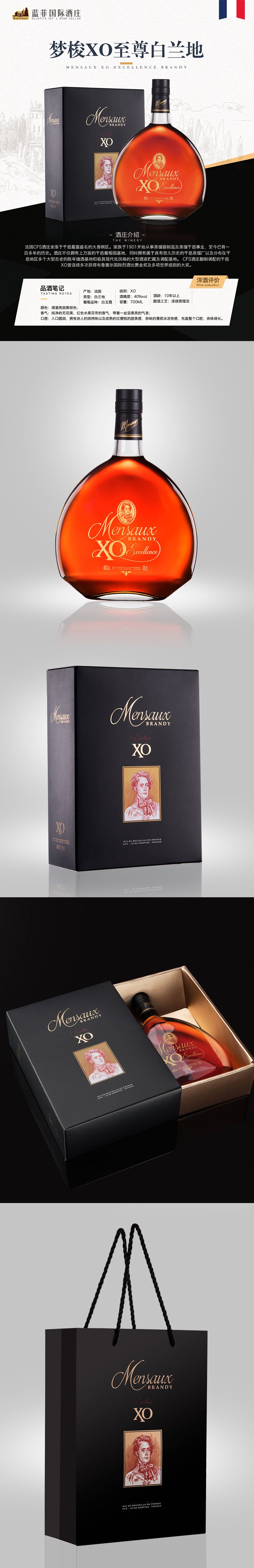 國家:法國類型:白蘭地葡萄品種:白玉霓酒精度:40%vol級別:XO容量:700ML工藝:連續蒸餾法酒齡:10年以上混釀:混合了13%干邑白蘭地色澤:清澈亮麗黃棕色;香氣:純凈的無花果、紅色水果芬芳的香氣,帶著一絲堅果類的氣息;口感:入口圓潤,擁有迷人的烘烤味以及成熟的紅櫻桃的甜美感,余味的薄荷冰涼快感,充盈整個口腔,余味綿長。