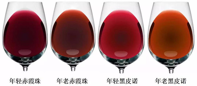 酒體輕盈的紅葡萄酒,如黑皮諾(Pinot Noir)和佳美(Gamay),顏色是從洋紅到石榴紅;酒體中等的紅葡萄酒,如梅洛(Merlot)和桑嬌維塞(Sangiovese),顏色比輕酒體的紅葡萄酒深,有點類似由淺到深的磚紅色;酒體飽滿的紅葡萄酒,如西拉(Syrah)和赤霞珠(Cabernet Sauvignon),顏色深濃,透明度很低。