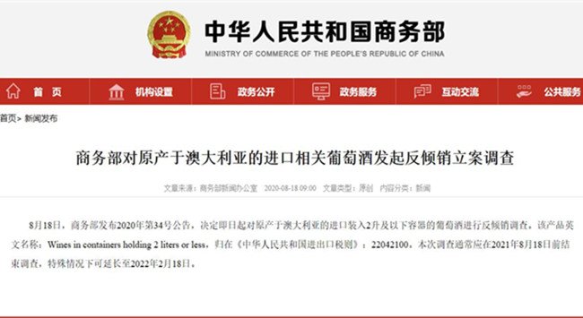 8月18日,商務部發布公告稱,決定即日起對原產于澳大利亞的進口裝入2升及以下容器的葡萄酒進行反傾銷調查。