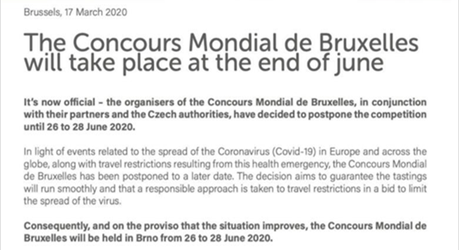 鑒于上述考量,2020年比利時布魯塞爾國際葡萄酒大獎賽將延期至6月26日-28日在捷克布爾諾舉辦。