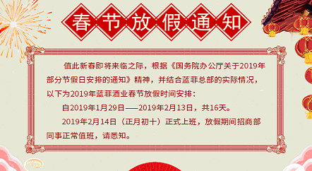 自2019年1月29日——2019年2月13日,共16天,為藍菲酒業(yè)春節(jié)假期,于2019年2月14日(正月初十)正式上班,放假期間公司安排人員正常值班,請悉知。